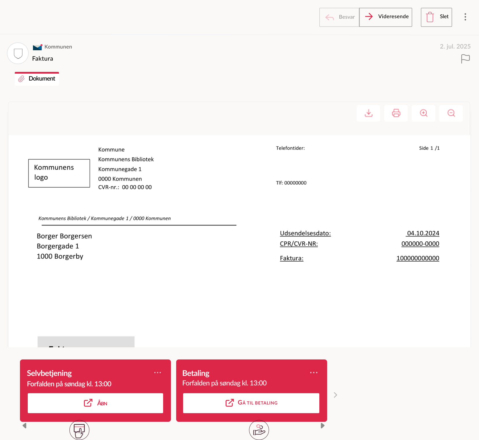 I det konkrete eksempel sender en kommune en biblioteksbøde til en borger, men eksemplet kan bruges som inspiration, hvis I sender breve med betaling til borgere eller virksomheder.