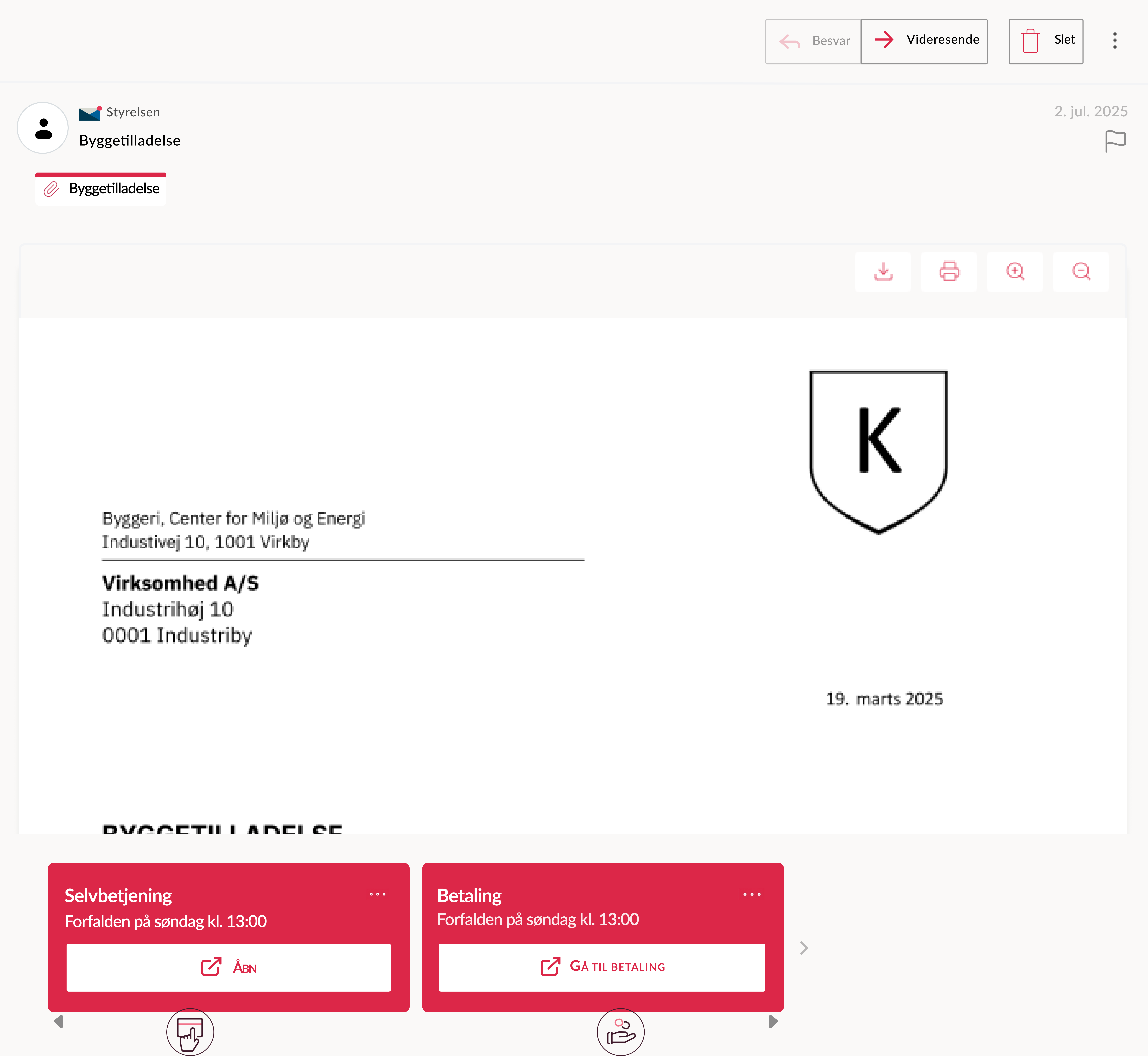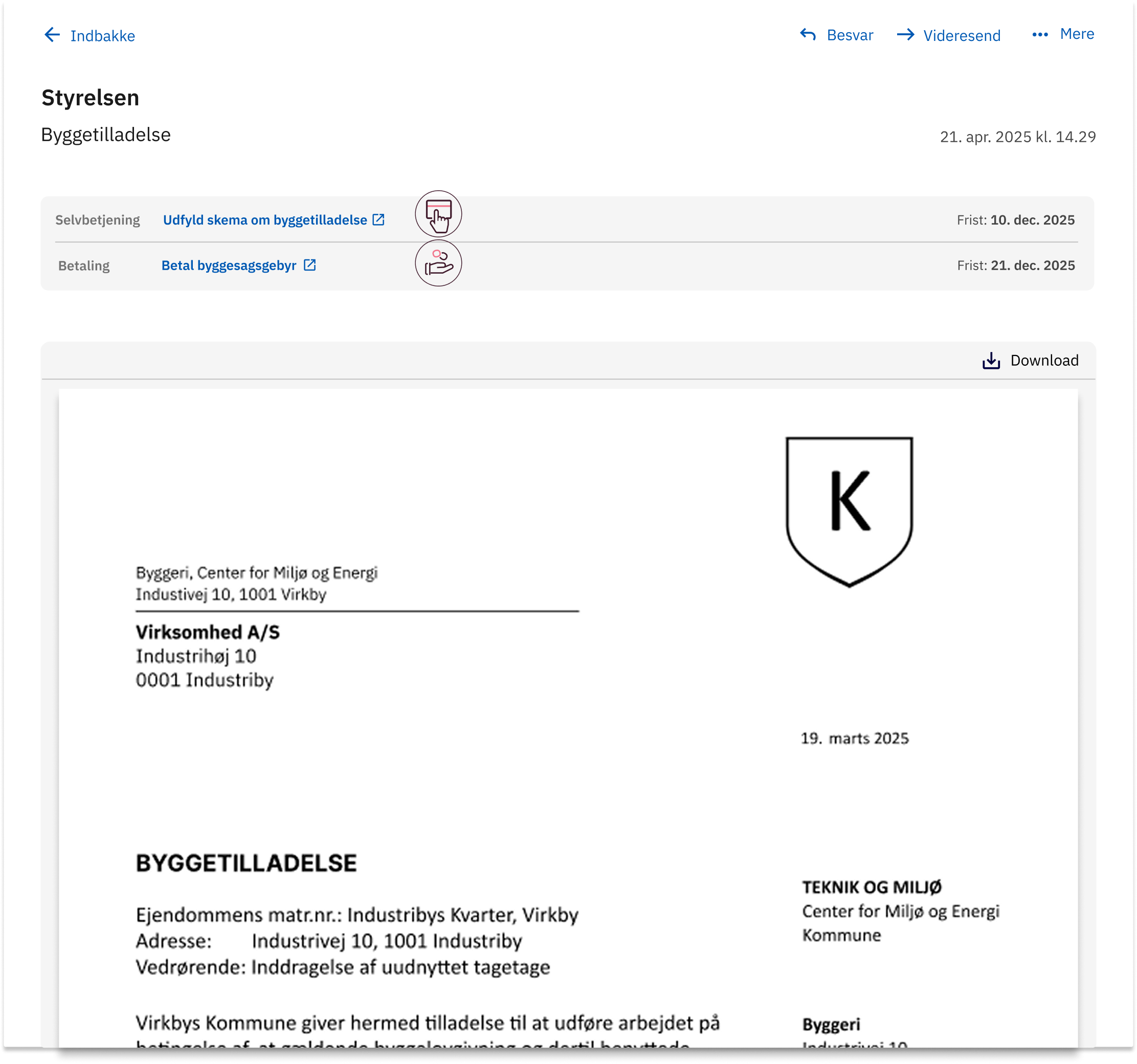 I forbindelse med byggeriet skal virksomheden desuden betale et byggesagsgebyr. For at gøre det lettere for virksomheden og dermed øge sandsynligheden for, at virksomheden betaler til tiden, har kommunen valgt at medsende et link til en betalingsløsning og fremhævet en betalingsfrist.