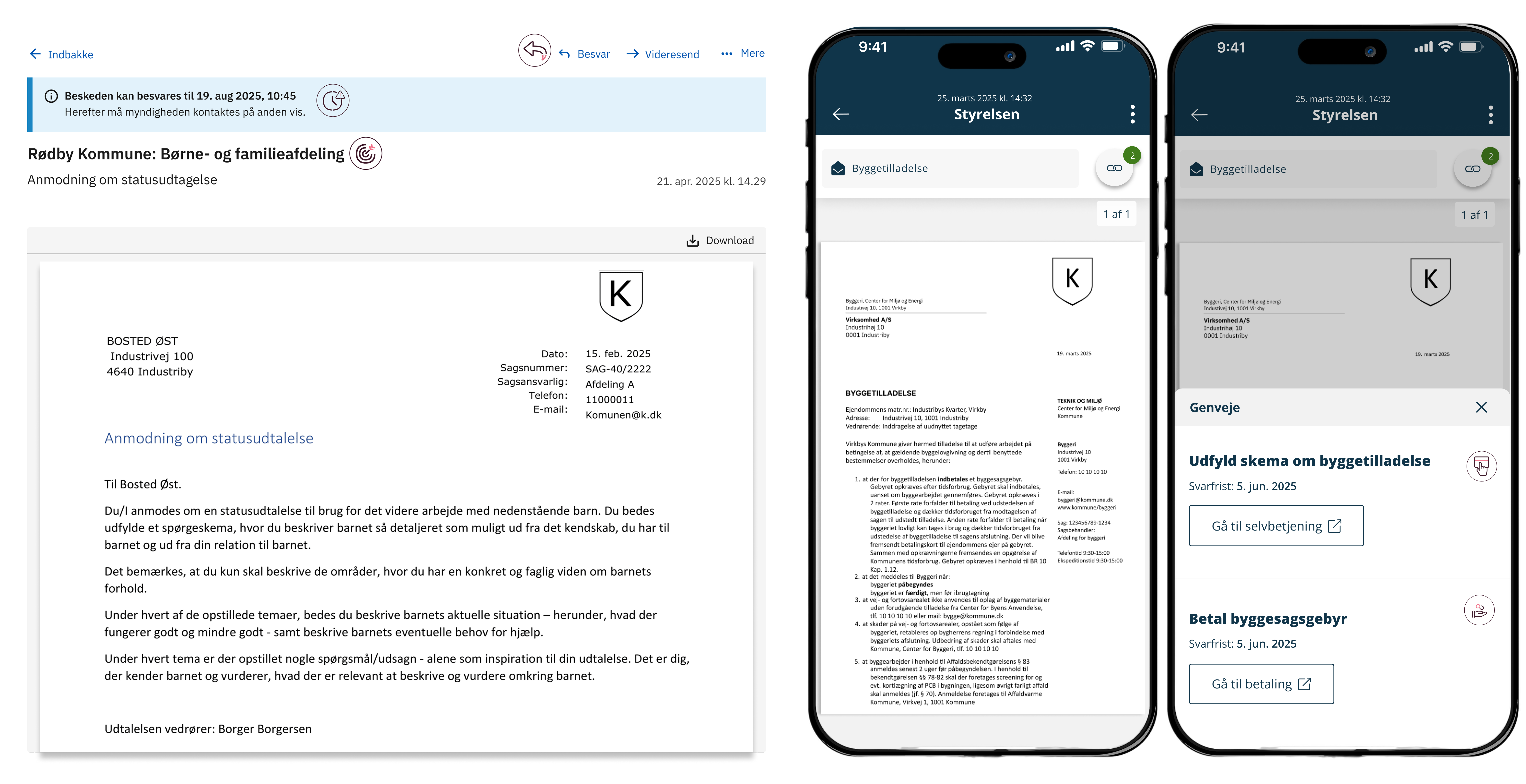 I det konkrete eksempel beder en styrelse om oplysninger i forbindelse med en byggetilladelse, men eksemplet kan bruges som inspiration, hvis I sender breve til borgere eller virksomhede, der skal føres videre til selvbetjening.