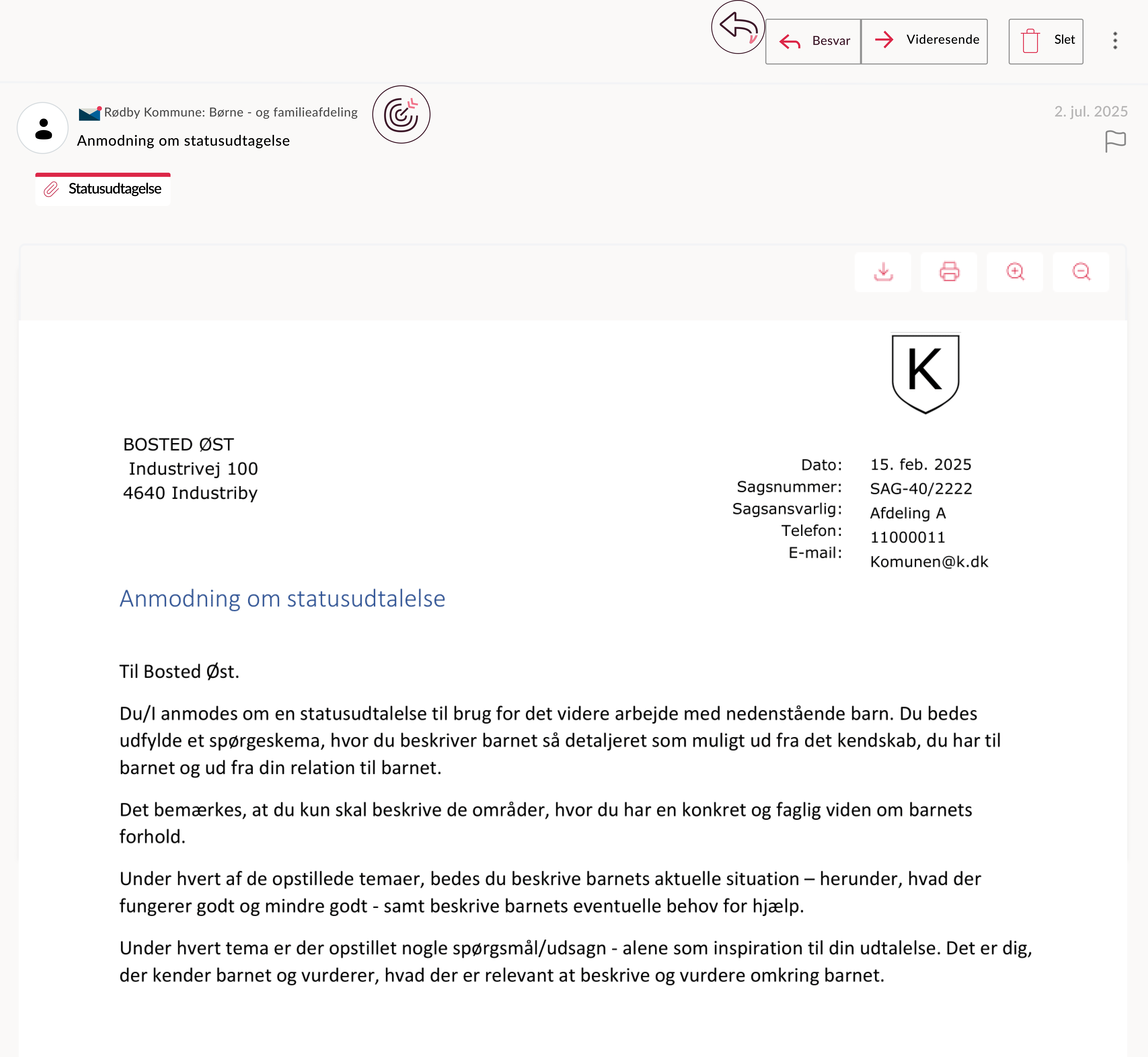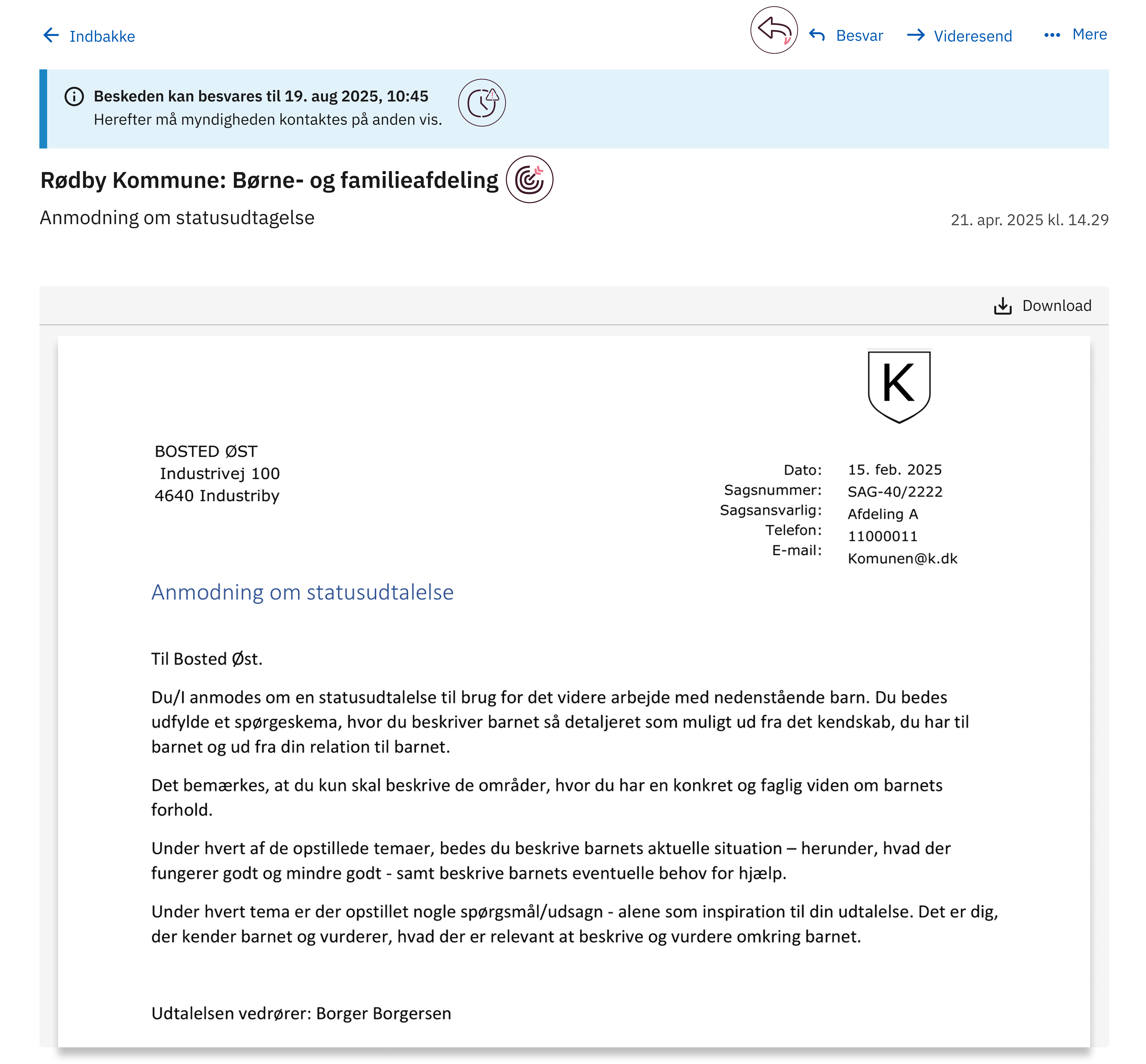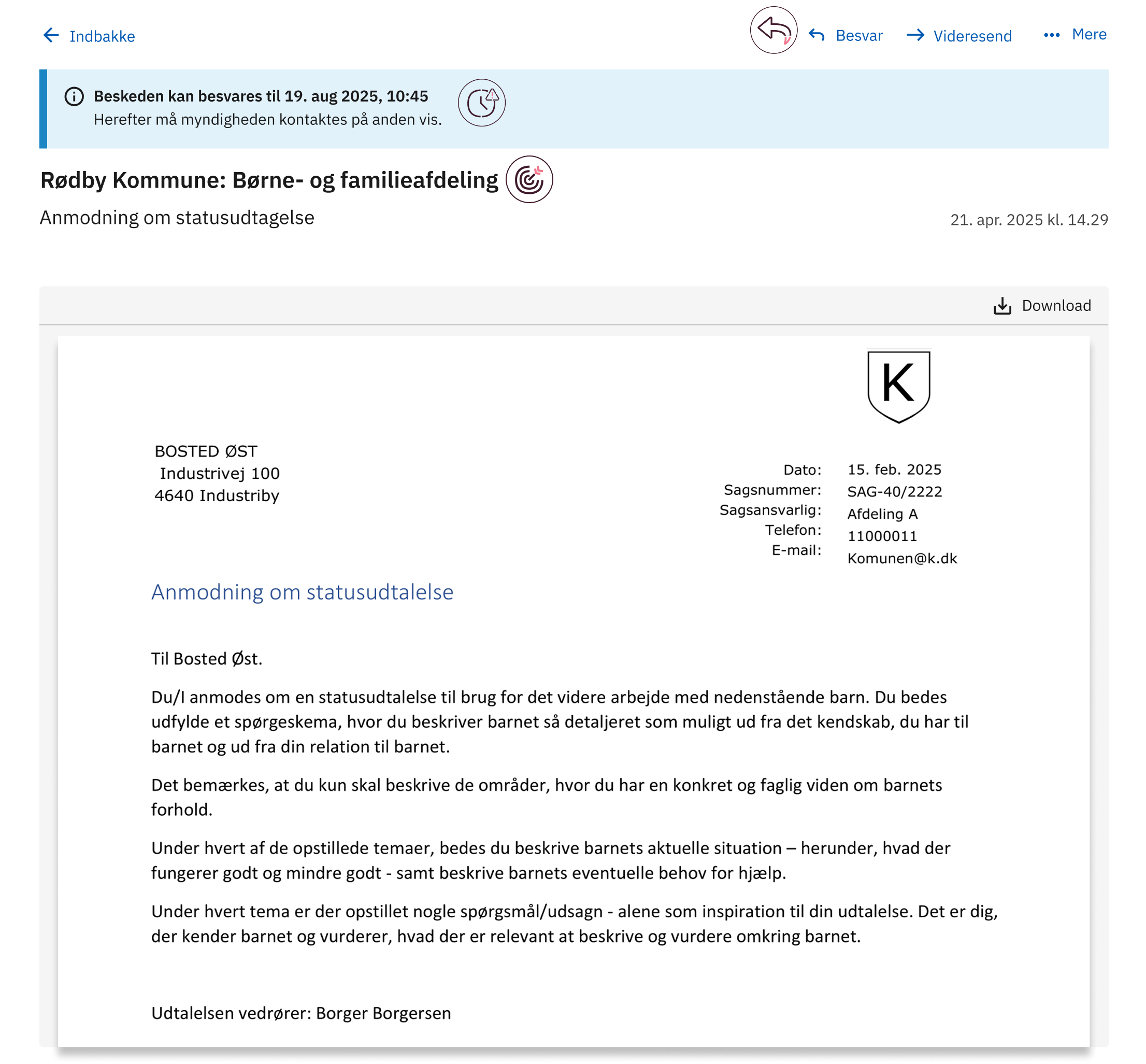 I det konkrete eksempel anmoder en kommune et bosted om en statusudtalelse, men eksemplet kan bruges som inspiration, hvis I sender breve til borgere eller virksomheder, hvor I har brug for, at de svarer.