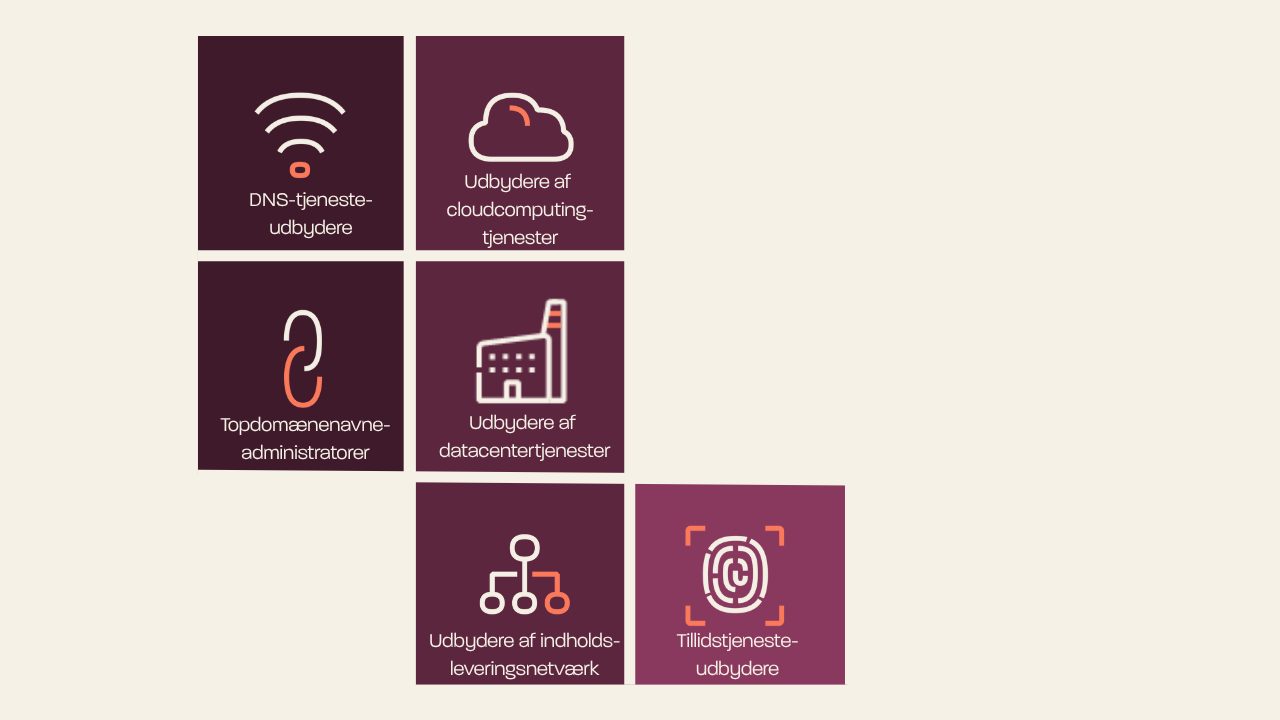 NIS 2-loven, § 3, pkt. 7: DNS-tjenesteudbyder: En enhed, der leverer a) offentligt tilgængelige rekursive domænenavnsoversættelsestjenester til internetslutbrugere, eller b) autoritative domænenavnsoversættelsestjenester til tredjepartsbrug, med undtagelse af rodnavneservere.